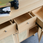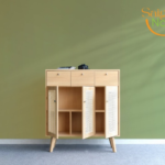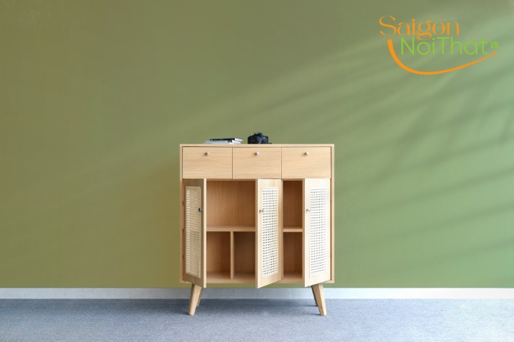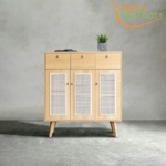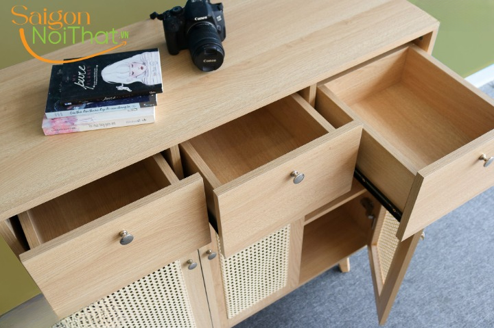 Thiết kế tinh tế từng đường nét, thi công thủ công với sự tỉ mỉ cao. Tủ kết hợp 3 ngăn kéo và có nhiều ngăn để đồ rất thích hợp cho các căn hộ chung cư vừa và nhỏ. Hoặc làm tủ trang trí trong phòng lớn